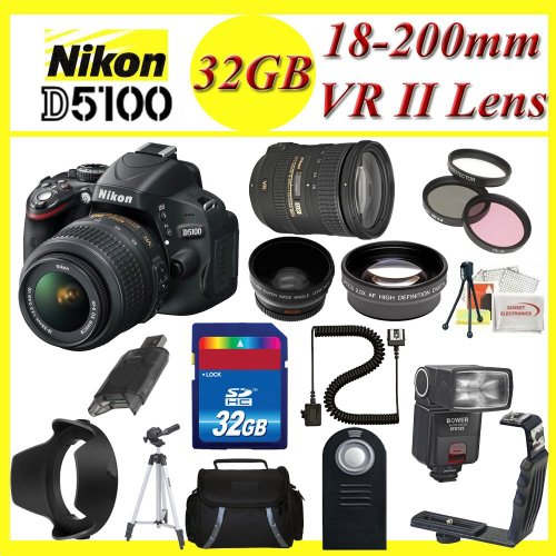 Nikon D5100 Digital SLR Camera with Nikon AF-S DX NIKKOR 18-200mm f/3.5-5.6G ED VR II Zoom Lens + 3 Extra Lens + 32GB SDHC Memory Card & More !!